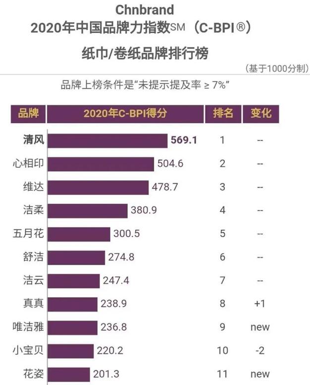 清風能夠連續(xù)兩年榮獲“2020年C-BPI中國品牌榜紙巾/卷紙類第一品牌*”,同公司品牌真真和唯潔雅也成功躋身前十,這不僅證明產(chǎn)品品質(zhì)得到認可,更意味著品牌獲得廣大消費者的喜愛與支持。