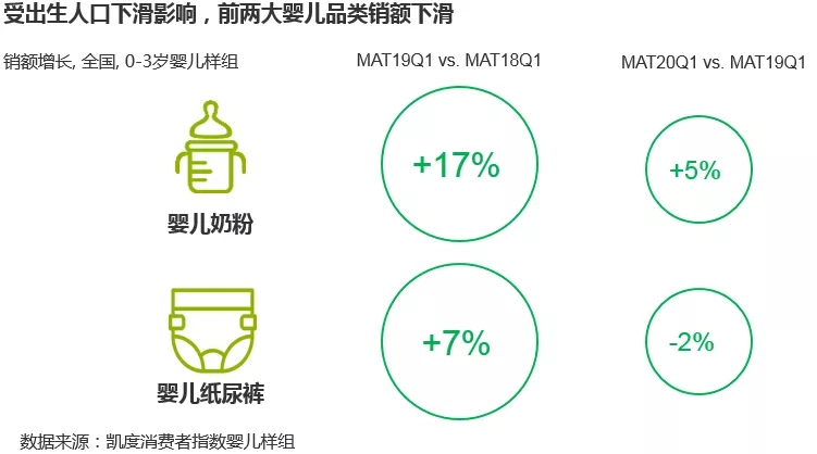 受到新生人口減少的影響,母嬰市場兩大頭部品類——奶粉和紙尿褲增長開始放緩。凱度消費者指數(shù)顯示,2019年一季度嬰兒紙尿褲銷售額同比增長7%,但2020年一季度同比下滑了2%,這一部分下跌與年初的疫情事實上關(guān)系不大。多位資深從業(yè)者表示,即便身處動蕩的疫情環(huán)境下,消費者對于奶粉、紙尿褲這樣的剛需產(chǎn)品的投入絲毫不會吝嗇。