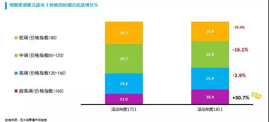2018年紙尿褲市場最明顯的變化是,多年來固化的內(nèi)外資品牌格局正在被打破,從花王、好奇、幫寶適、尤妮佳、大王為代表的外資大牌紙尿褲發(fā)展態(tài)勢來看,花王和好奇紙尿褲在大幅下滑,尤妮佳開始超越花王,幫寶適借一級幫觸底反彈,大王紙尿褲正處上升盛世,不過增長壓力、控價壓力越來越大。與此同時,高端紙尿褲市場出現(xiàn)突破機會。從尼爾森零售市場數(shù)據(jù)來看,2018年160元以上超高端價位的紙尿褲銷售額增長超30%,對比鮮明的是,中低端紙尿褲市場下滑嚴(yán)重。目前紙尿褲市場中,進(jìn)口有機材質(zhì)、日夜用等細(xì)分概念,以及適合寶寶運動的拉拉褲在引領(lǐng)行業(yè)增長,尤其是三四線城市增長迅速。
