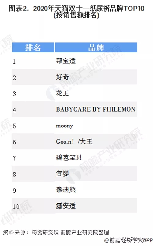 作為母嬰領(lǐng)域剛需、高頻的消費(fèi)類目,紙尿褲需求量巨大,由于父母對于嬰幼兒健康愈發(fā)重視,消費(fèi)者對于紙尿褲的品牌同樣重視。2020年天貓雙十一嬰童尿褲品牌TOP10中,幫寶適毫不疑問依然位居首位。