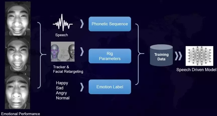 為此,團隊建立了一套精確的面部動捕流程,以不同情感下的動作捕捉,來訓(xùn)練語音驅(qū)動模型,最終構(gòu)造了一個長約20個小時、13339條語句的,包含語音、面部運動和身體運動的多模態(tài)訓(xùn)練數(shù)據(jù)集。在Siren AI 基礎(chǔ)上,增加情感維度數(shù)據(jù),讓Matt擁有微笑、蹙眉等微表情,多了更自然的“人情味”。