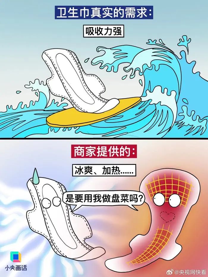 【#別拿消費主義那套來做衛(wèi)生巾#】想不通,衛(wèi)生巾這種每個月都要用的東西,怎么會做得又貴又難用。商家以為我需要:加冰、加熱、加玻尿酸、粉嫩包裝、明星代言……實際我需要的:干凈衛(wèi)生、護翼好貼、安全不漏、價格適中。衛(wèi)生巾是日用品,別搞消費主義輕奢那一套。(繪圖.阿彬的漫畫生活)#有種女性貧困叫月經(jīng)貧困#
