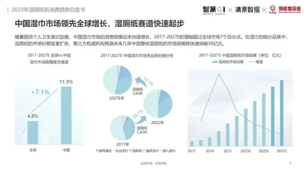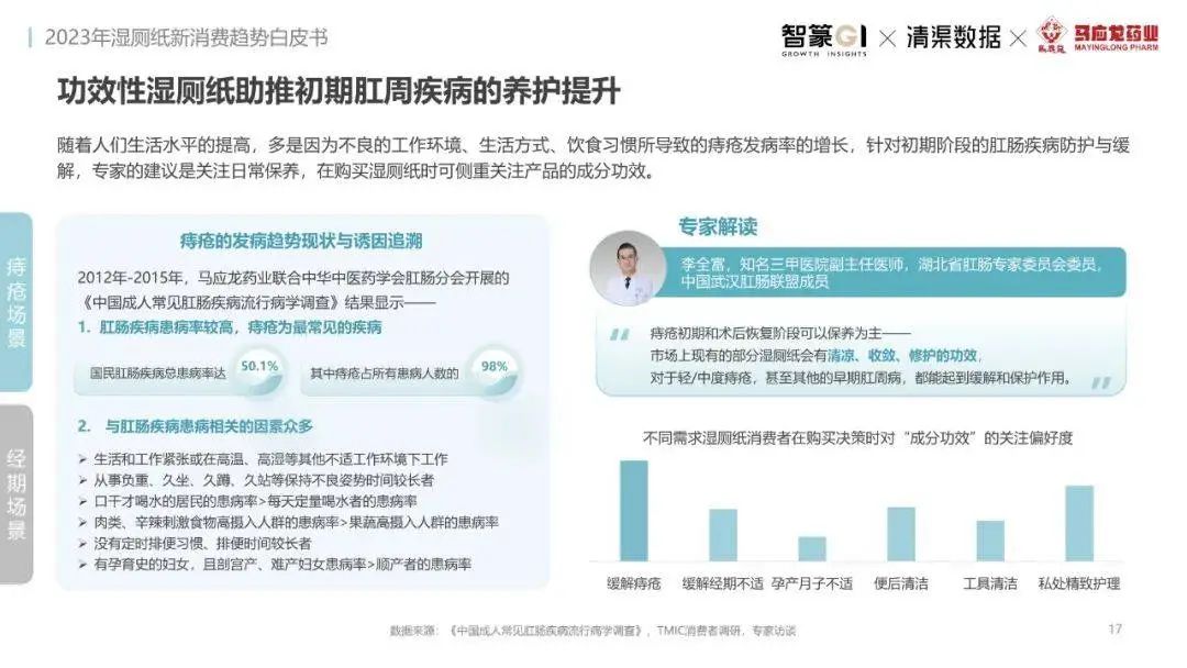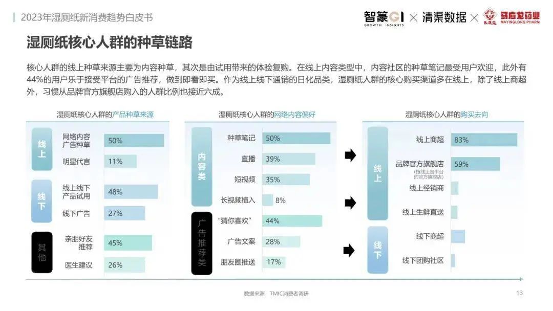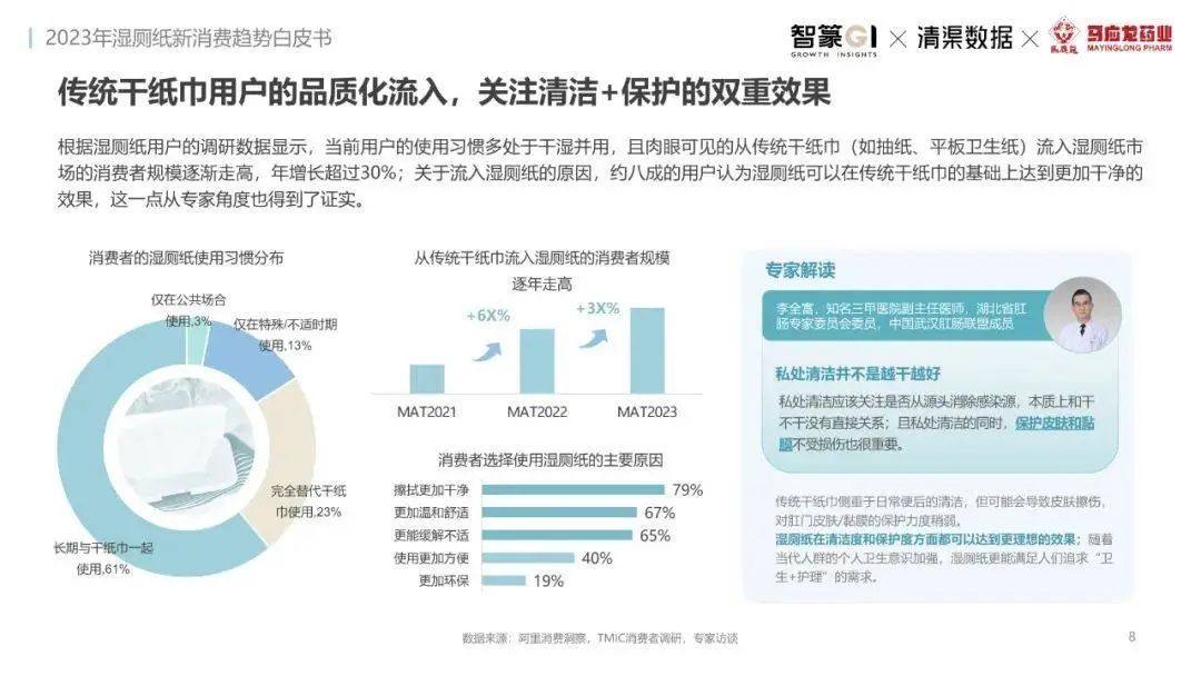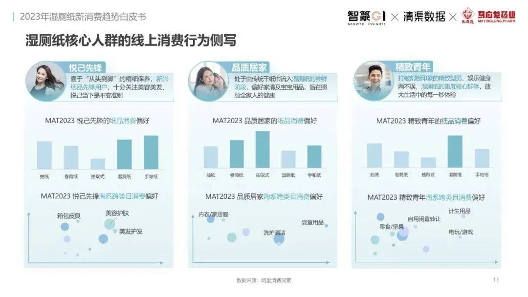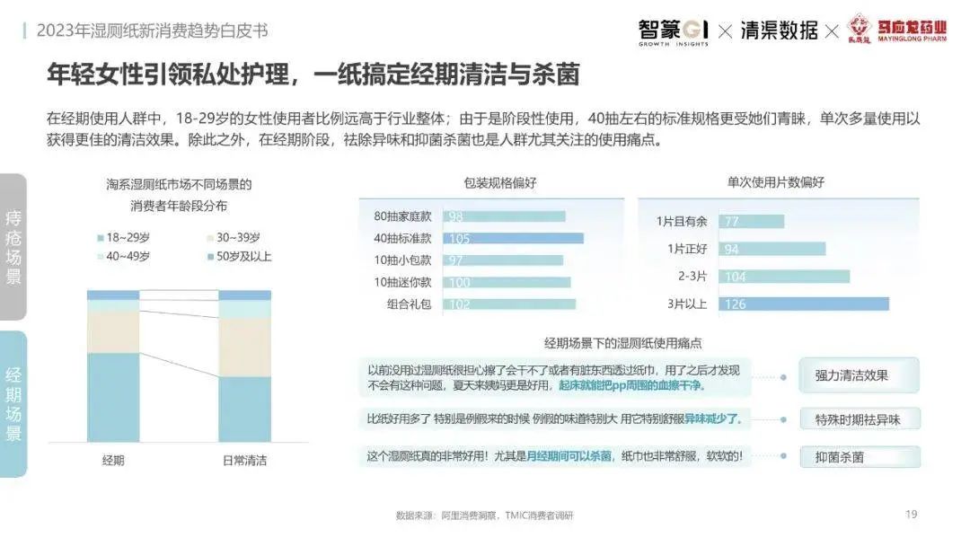 淘系濕廁紙品類近三年的消費(fèi)金額持續(xù)增長(zhǎng),增幅遠(yuǎn)超衛(wèi)生用紙整體市場(chǎng),其中,天貓官旗的消費(fèi)責(zé)獻(xiàn)占主陣地,MAT2023占淘系年度消費(fèi)的六成以上,市場(chǎng)規(guī)模的擴(kuò)張主要來自消費(fèi)人數(shù)的增長(zhǎng),有越來越多的新客涌入,共同推動(dòng)溫廁紙的全民風(fēng)潮,同時(shí),消費(fèi)者的使用習(xí)慣養(yǎng)成,復(fù)購(gòu)意愿顯現(xiàn),消費(fèi)頻次也達(dá)到衛(wèi)生用紙整體的增速。